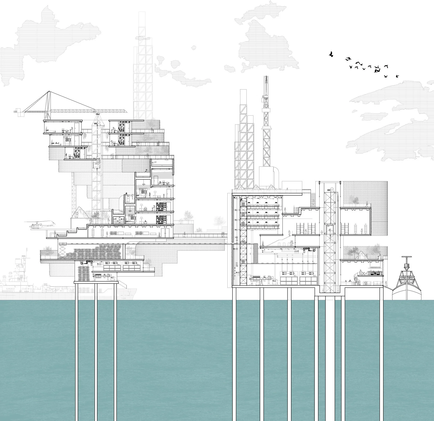 Salinetorium is a museum park and factory island that uses both reverse osmosis and thermal desalination to self sustain itself and provide a space for learning about the life cycle potentials of salt, the importance fo water, and the importance of renewable versus non renewable energy (the history behind the oil rig). We saw potential in the resulting brine and salt from desalination to be used to create materials and resources that slowly turn the rig into a human habitat and later an extension of the proximate water. Desalination is the process of turning sea water into potable water. Key to this process is reverse osmosis, which involves forcing water through a membrane at high pressure, so salts are removed from the water. The salt in desalination brine - the residual solution from the desalination process - originates from the sea, and the discharge returns it to the source, often times in irresponsible and non sustainable ways. `